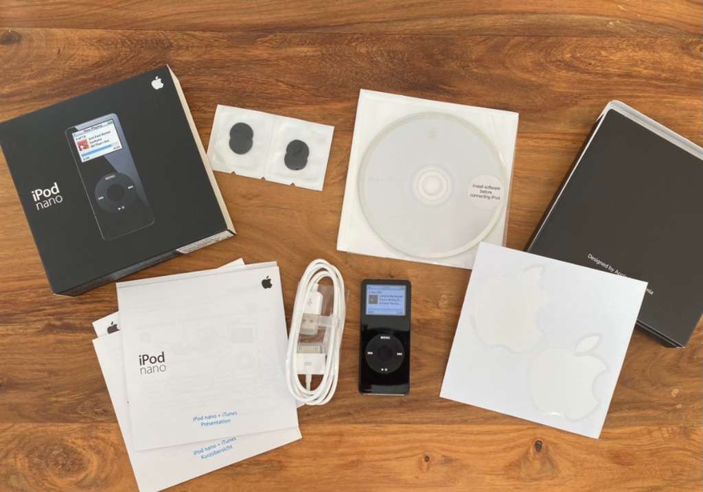 Hier gibts eine echte Rarität - einen iPod nano der ersten Generation mit Zubehör und Verpackung wie auf den Fotos zu sehen ist, Akku dem Alter entsprechend auch noch OK: vor 6 Stunden eingeschaltet und Anzeige sagt noch 30-50%.