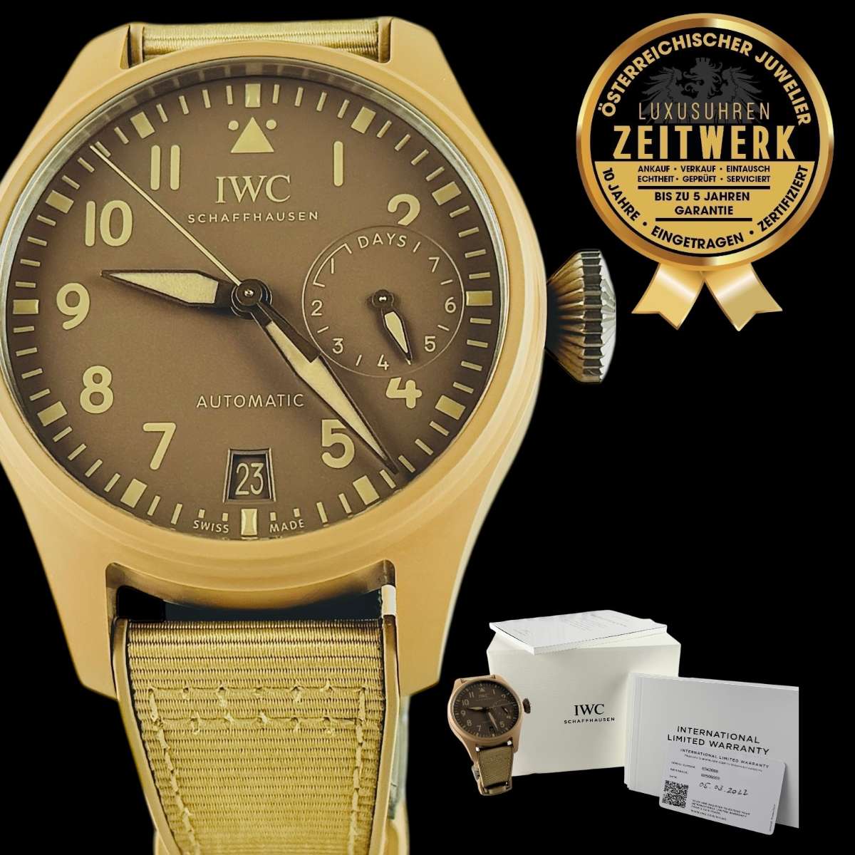 IWC BIG PILOT TOP GUN MOJAVE DESERT SPECIAL EDITION 46mm, WUNDERSCHÖNER ZUSTAND, MIT IWC PAPIERE AUS 03/2022 (Listenpreis € 17.000) GEKAUFT IN MÜNCHEN BEI IWC! VOLLE 3 JAHRE GARANTIE VON UNSEREM HAUSE, GERNE TAUSCHEN WIR AUCH EIN