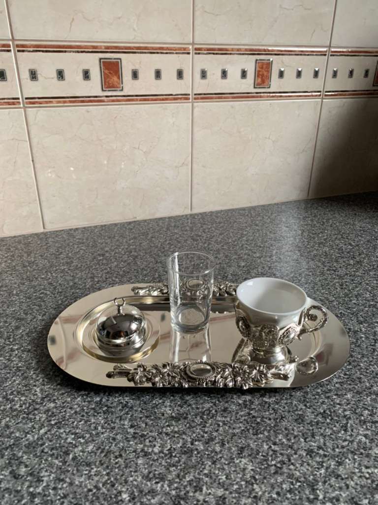 Servierplatte,Wasserglas , Süssigkeitenschale und Mokkatasse.War nie im gebrauch daher wie neu!!