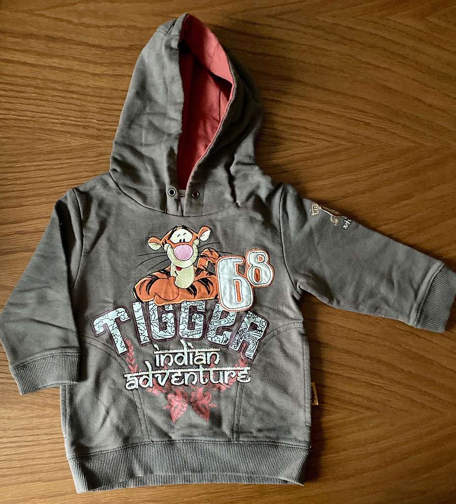 Verkaufe bedruckten Kinder Kapuzen-Pullover mit Tigger Logo, Größe 92, in gutem Zustand.