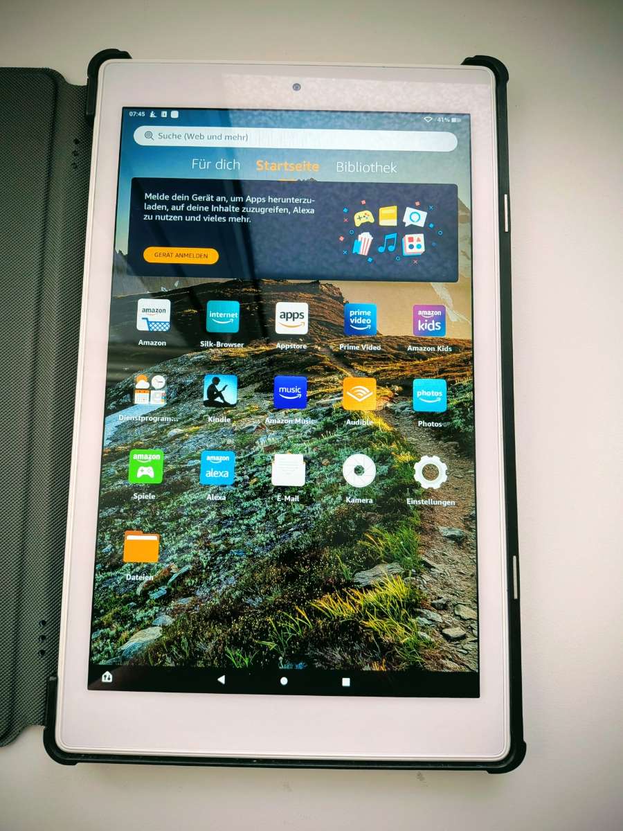 Kindle fire 10 Zoll, 32 GB, inkl. case stand, welcher beim Schließen das Gerät auf Standby schaltet.
