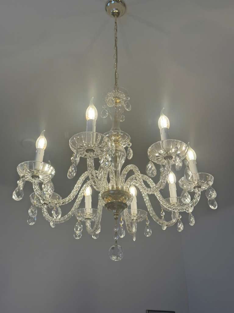 Der Leuchter verfügt über 8 Lichtarme, einen klaren Glaskorpus mit gedrehten Armen sowie einen reichhaltigen Kristallbehang aus Tropfen und Prismen. Er sorgt für ein warmes, funkelndes Licht und ist ein echter Blickfang in jedem klassischen sowie modernem Interieur