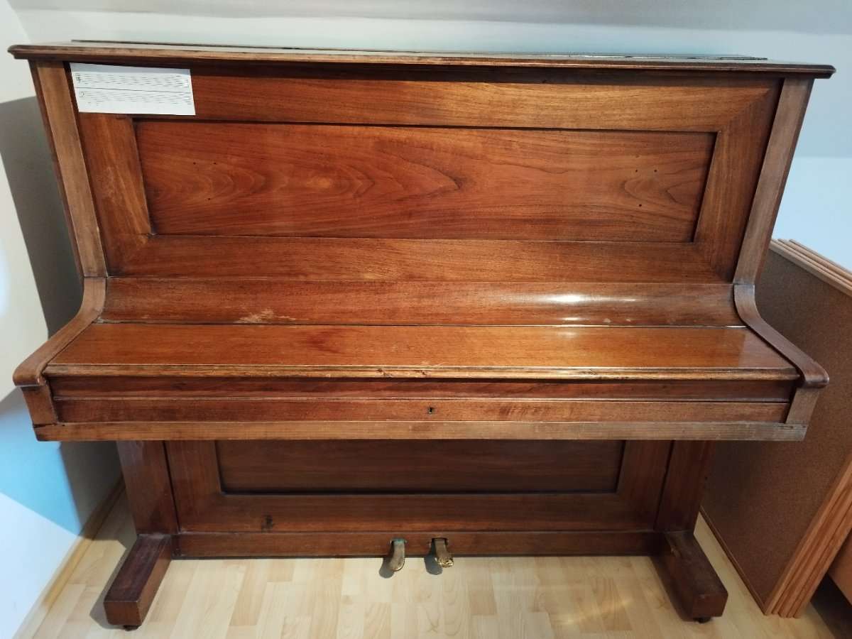 Das Klavier steht im 1. OG und muss über eine gedrehte Stiege hinuntergetragen werden.