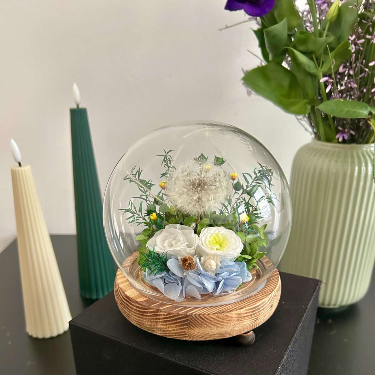 Es handelt sich dabei um eine hochwertige Glaskugel auf einem Holzsockel, in der zu 100% echte, konservierte Pflanzen kunstvoll arrangiert sind. Das Design mit weißen Rosen, blauen Hortensien und der Pusteblume soll an den blauen Himmel, Wolken und die Natur erinnern.