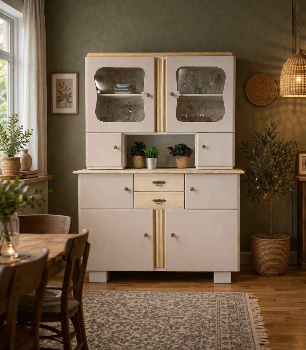 Hinter den verglasten Türen entfaltet sich ein zartes Spiel aus Licht und Struktur: die florale Innenauskleidung verleiht dem Möbel nicht nur Tiefe, sondern auch einen Hauch Romantik. Hier darf Lieblingsgeschirr glänzen, Erinnerungen wohnen, Alltag zu etwas Besonderem werden.