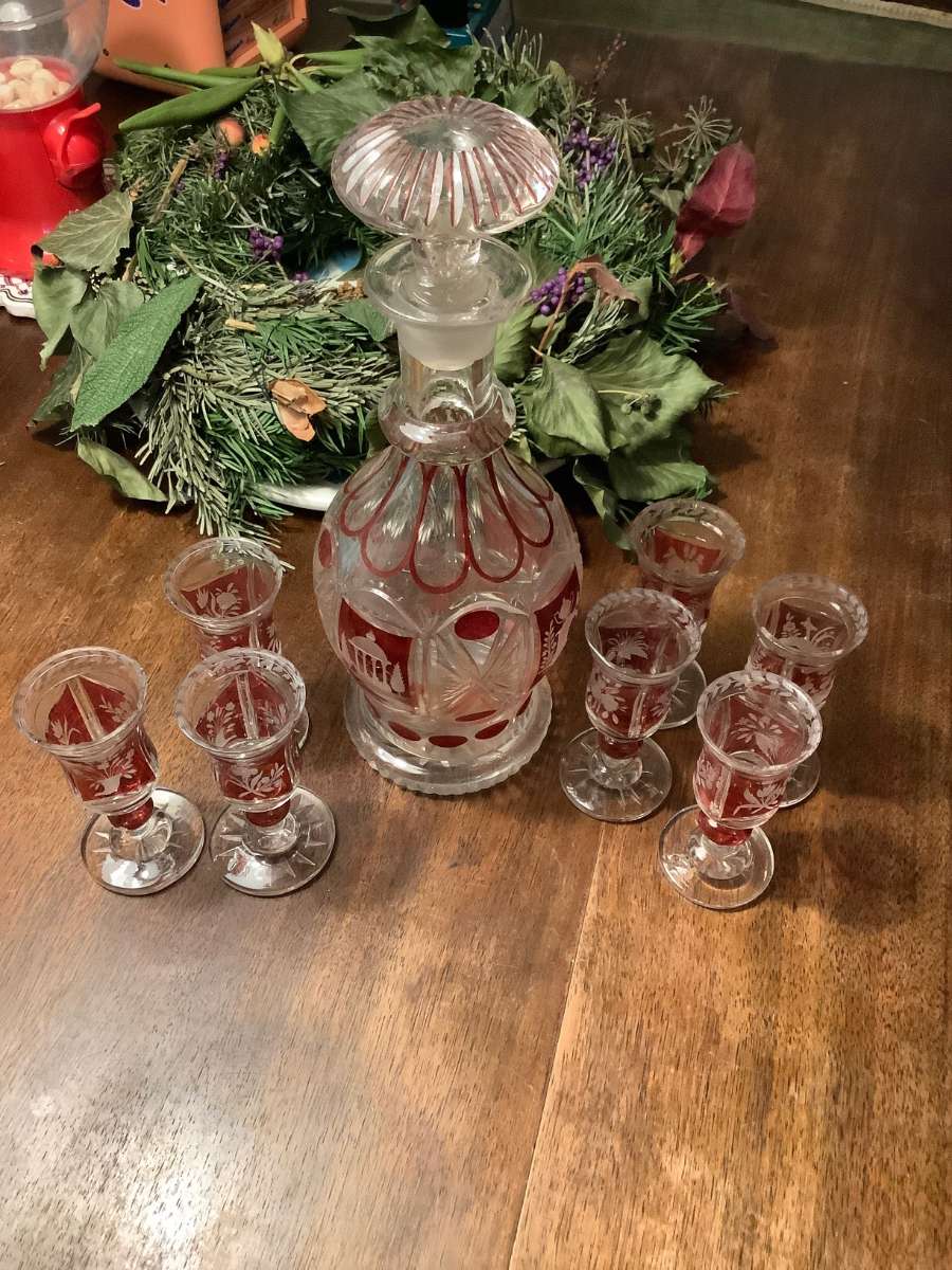 Sehr hübsche Kristallkaraffe und 7 Gläschen mit rotem Muster