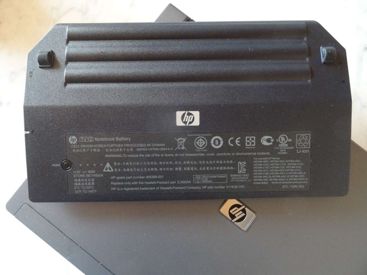 Zusatzakku für HP-Laptop; wird einfach an der Rückseite des Laptops aufgesteckt und damit auch über den Laptop geladen.