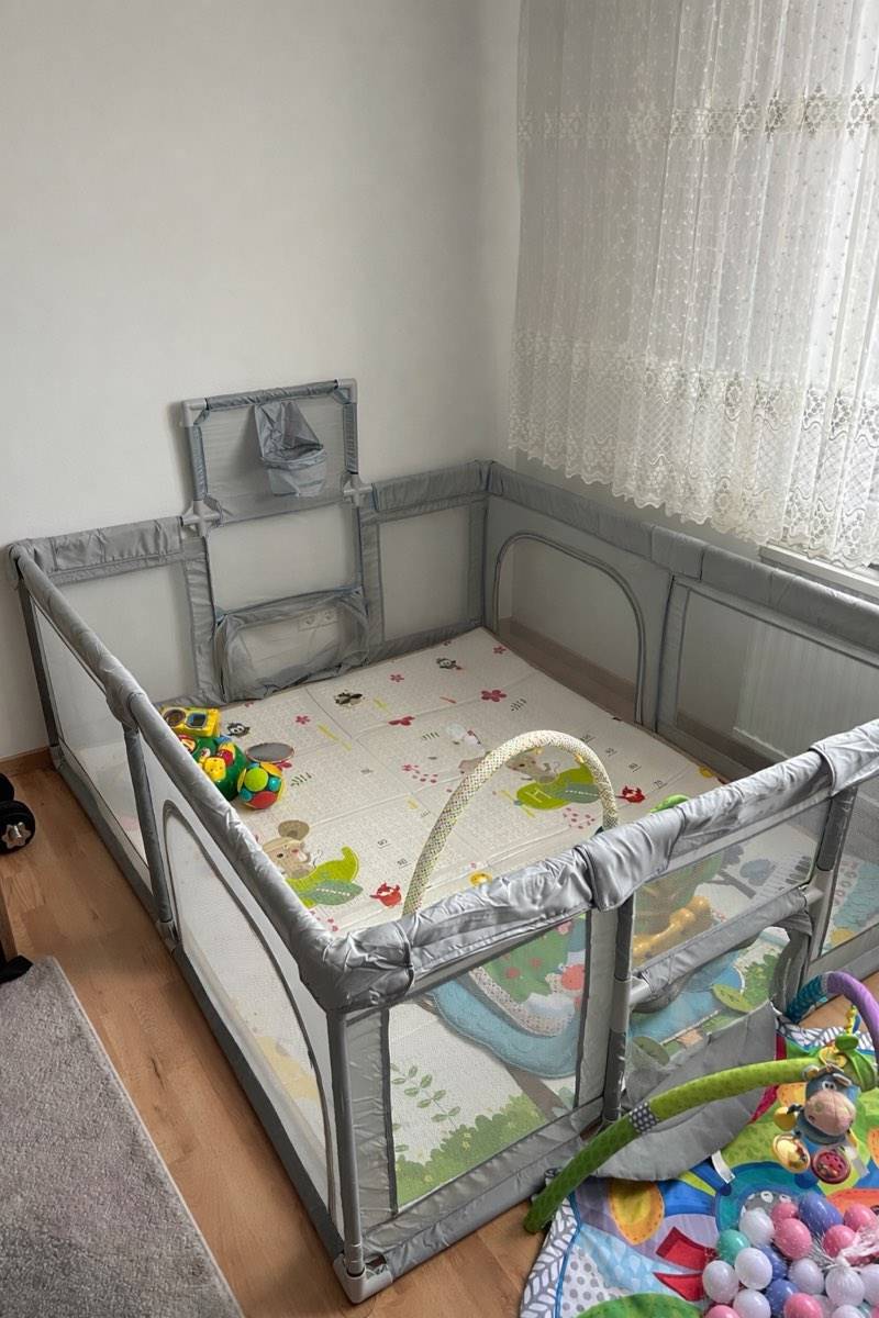 Der Laufstall ist stabil, rundum gepolstert und mit Netzseiten ausgestattet, sodass man das Kind jederzeit gut sehen kann. Perfekt zum sicheren Spielen und Krabbeln.