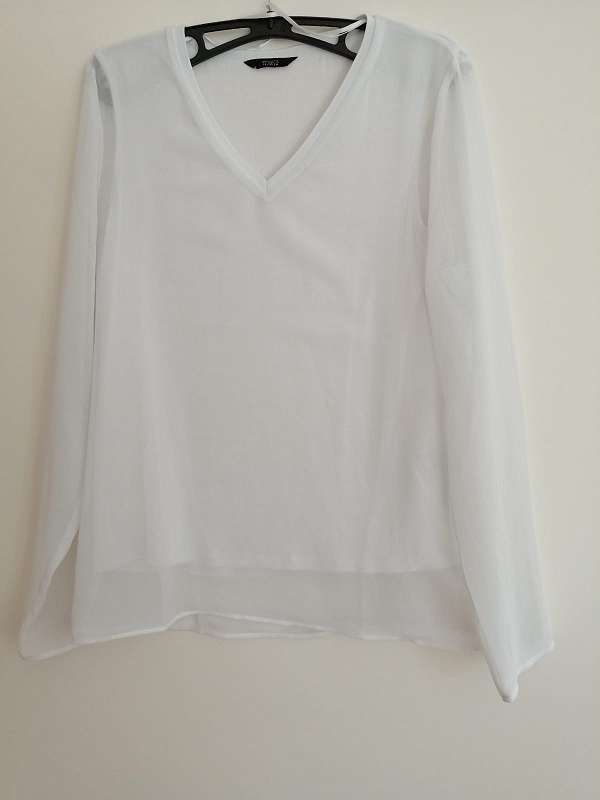 Weiße Layering-Bluse mit V-Ausschnitt aus Polyester. Fütterung aus Viskose. Ärmel sind transparent. Gerader Schnitt. Größe 38, C&A
