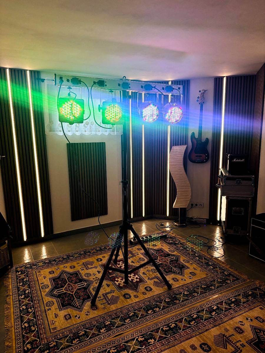 Voll funktionstüchtige Lichtanlage mit 4 LED Par Scheinwerfer, einstellbar auf Automatik, Musik oder fix, DMX steuerbar, Scheinwerfer auch einzeln verwendbar.