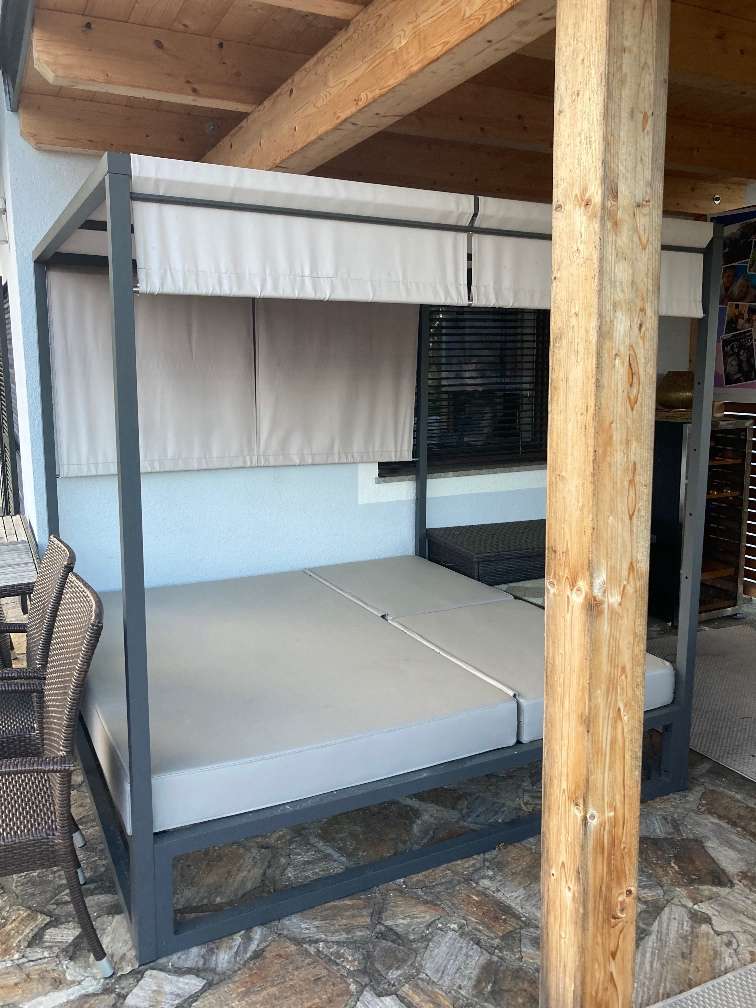 Dieses neuwertige Loungemöbel im Ausmaß von 2x2x2 Meter mit hochstellbarem Kopfteil und Dach, Antrazhit und hellgrau steht aus Platzgründen zum Verkauf