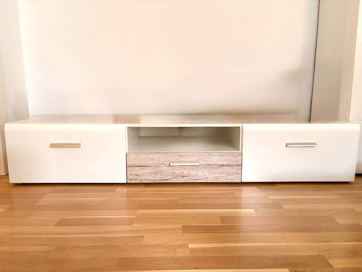 Zum Verkauf steht ein weis/grau Lowboard in gutem Zustand mit 3 geräumigen Laden.