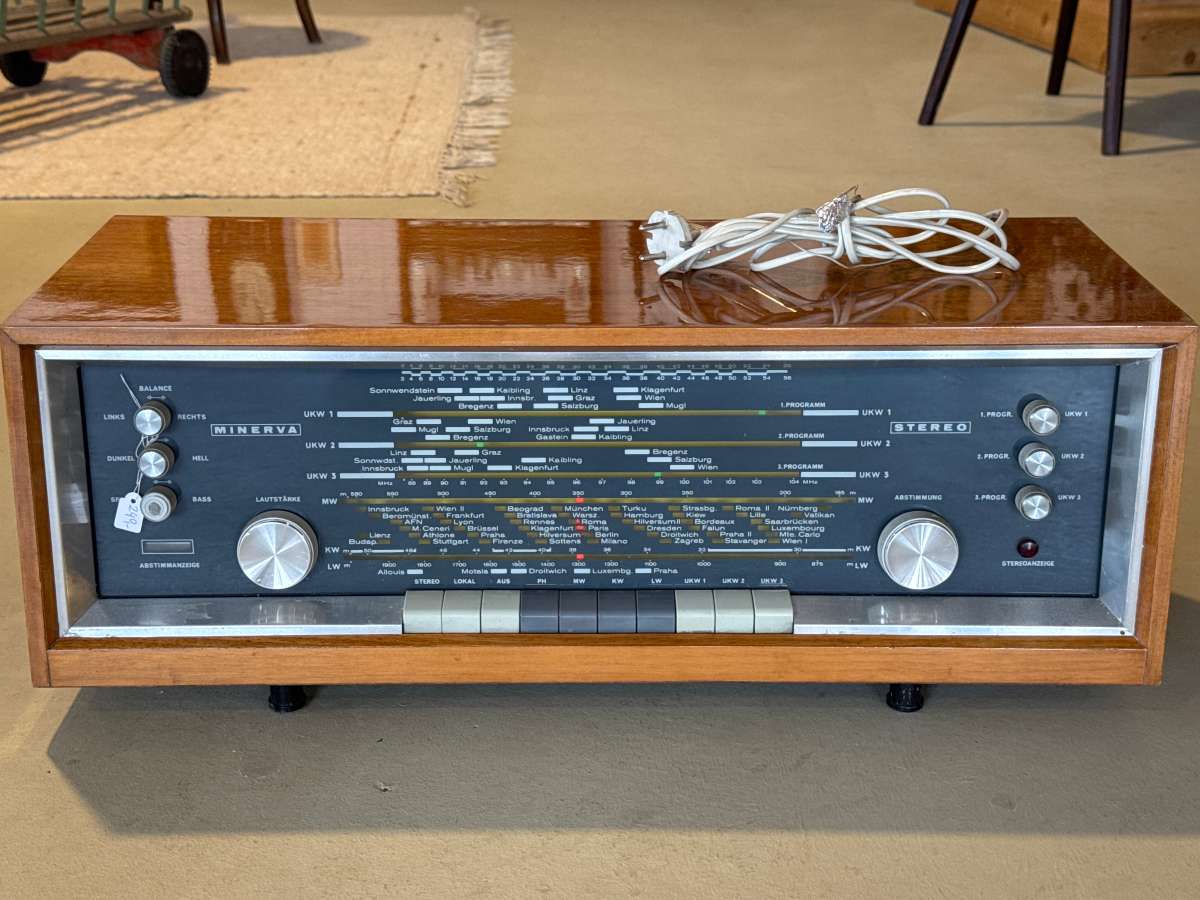 Zum Verkauf steht ein Minerva Radio Stereo 655 aus den Jahren 1967–1969. Mit 60 Watt Leistung, „Made in Austria“, überzeugt es durch originalen Charme und voll funktionsfähige Technik. Ein seltenes Sammlerstück für Liebhaber klassischer Radios.