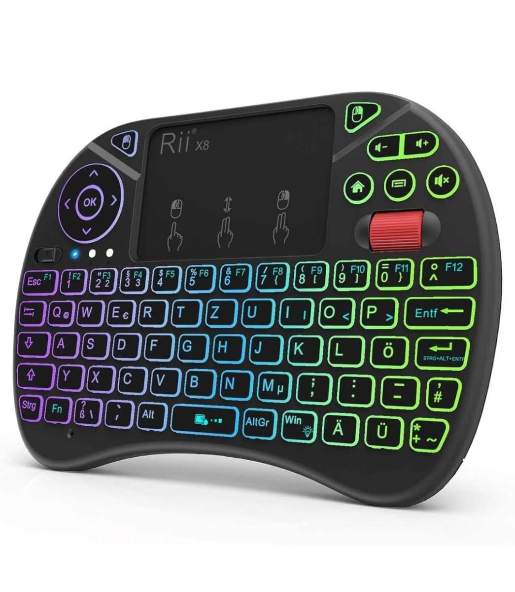 Rii Mini Tastatur Mit Touchpad, 2,4 GHz Kabellos, Smart TV, 8 Farbige Hintergrundbeleuchtung und Scrollrad (Deutsches, Schwarz)