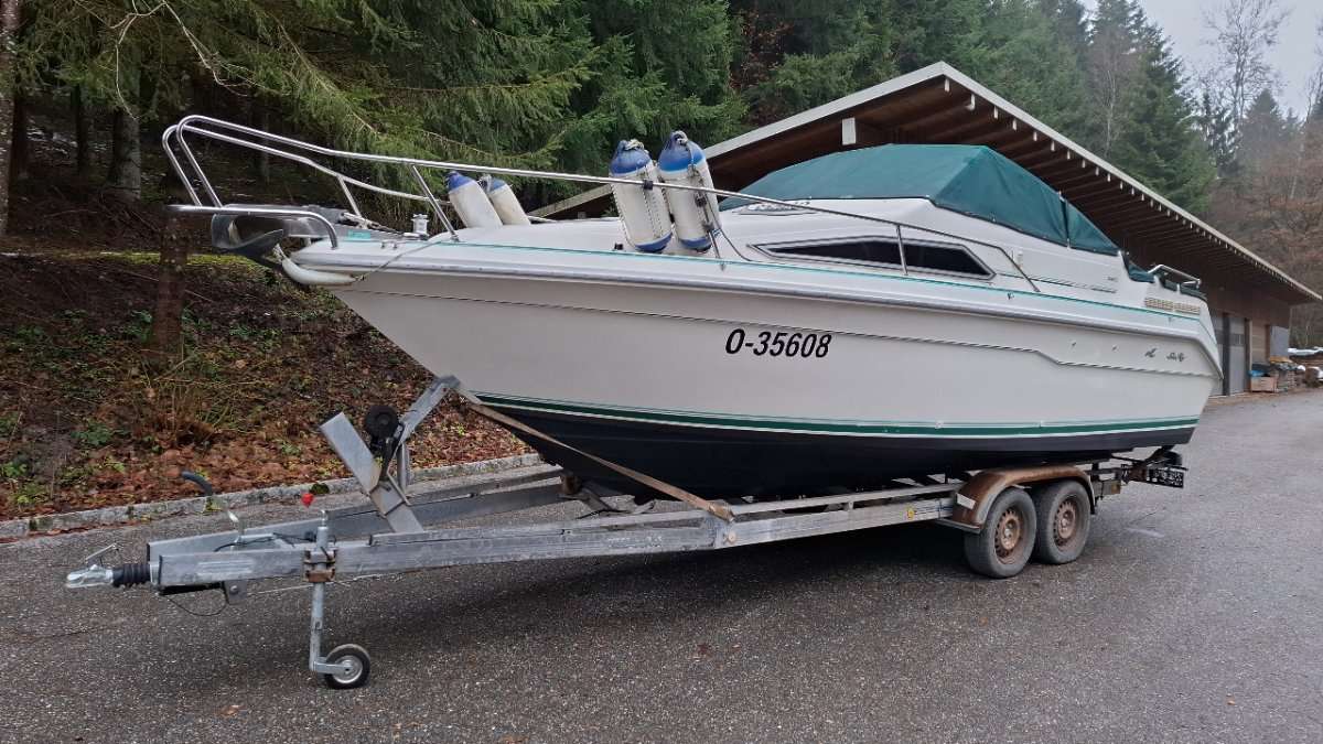 Das Boot steht auf einem Trailer mit ehemaliger deutscher Zulassung, er wurde von uns und den Vorbesitzern aber nur als Hafentrailer benutzt somit hat er KEINE gültige Zulassung!