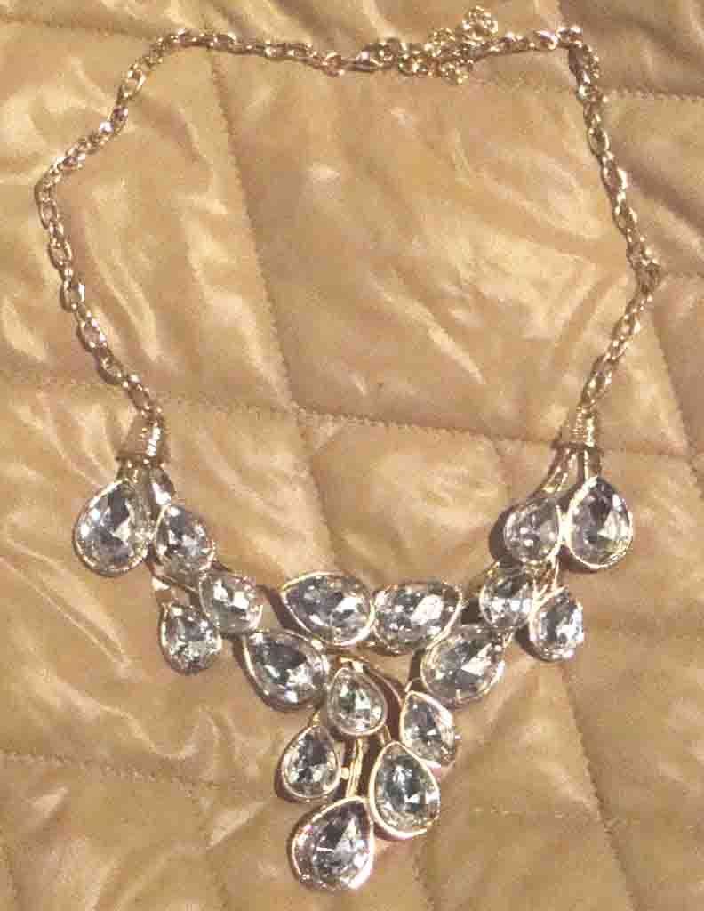 Geschliffene, klare Steine in Tropfenform ca. 15-20 mm, auf ca. 15 cm Breite, verlaufend von 30 zur Mitte auf 70 mm breit. Gesamtlänge verstellbar bis ca. 56 cm, in gold farbenem nickelfreien Metall gefasst. Nicht getragen !!