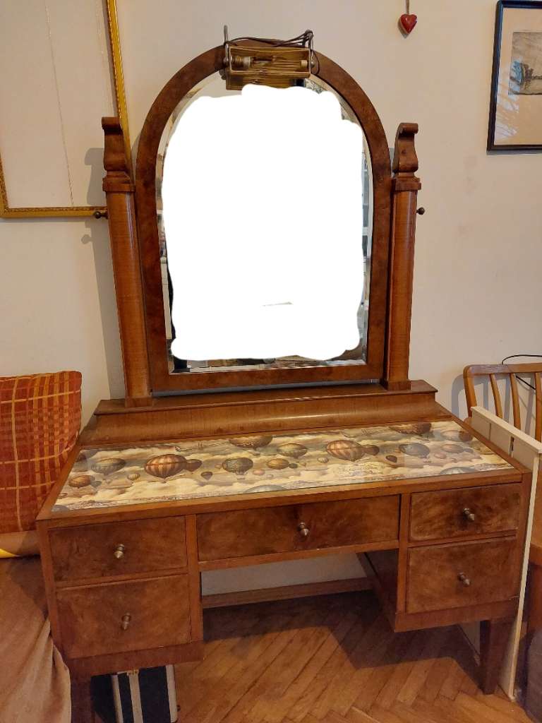 Der Zustand ist dem Alter entsprechend gut, Bj 1920er Jahre. Original Glasscheibe. Spiegel ok. Beleuchtung momentan nicht funktionstüchtig. Laden gehen sehr gut.