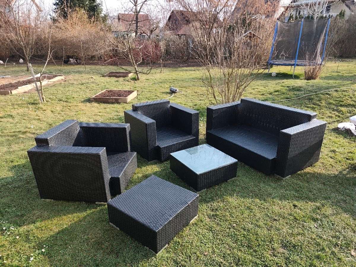 Die Möbel befinden sich in einem guten Zustand und sind stabil. Die passenden Polster können mitgegeben werden. Bei einigen Polstern müsste jedoch der Bezug teilweise gewechselt werden.