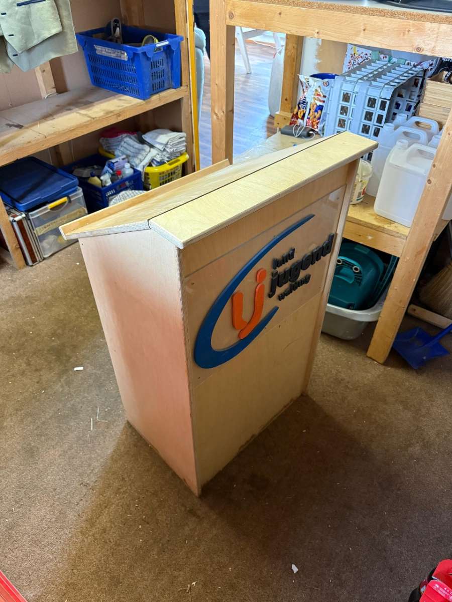 Verlaufe dieses Rednerpult (ohne Logo) aus Holz. Maße sind auf den Fotos zu sehen. Guter Zustand, wird nicht mehr verwendet.