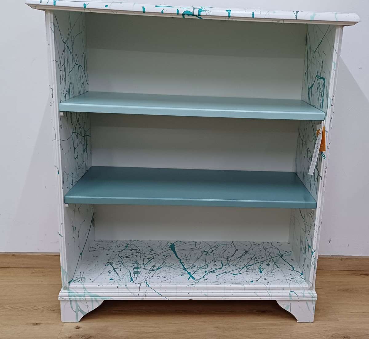Dieses originelle Regal wurde in unserer Salzburger Werkstatt generalüberholt und bekam einen künstlerischen Anstrich. Die Einlegeböden sind in zwei verschiedenen Blautönen lackiert, der Korpus wurde in einem warmen Cremeweiß gestrichen und mit frischen Blautönen künstlerisch gestaltet.