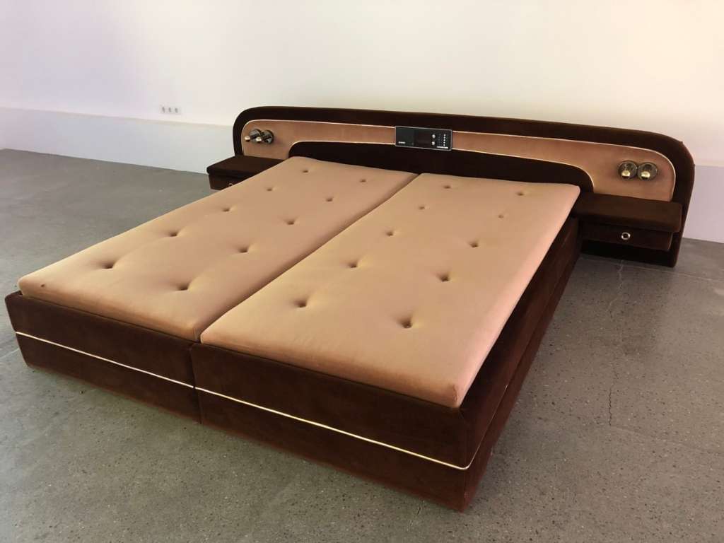 Retro-Elvis-Doppelbett in beige-goldenem Velours mit eingebautem Radio und Retro-Lampen und Nachttisch.
