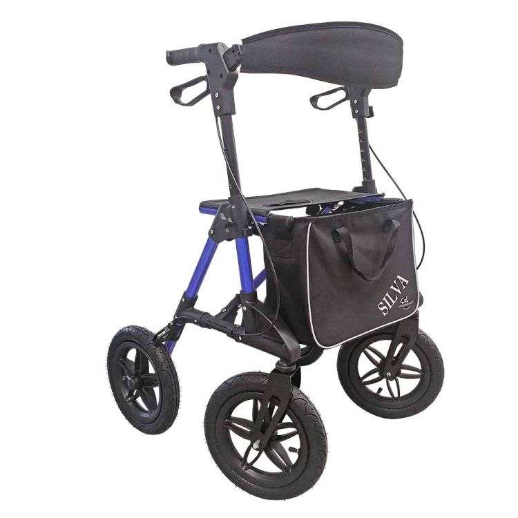 Der Silva Leichtgewichtsrollator verfügt über höhenverstellbare Griffe und ist mit einer Tasche sowie einem Stockhalter hat ein stabiles Aluminiumgestell und eine Steighilfe für Gehsteigkanten. Zudem ist er faltbar und mit einer Luft-Bereifung sowie einer Kreuzstrebe versehen.