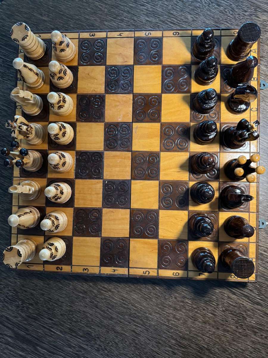 Schachfiguren aus Holz inkl. Brett, 40 x 40 cm, ca. 60 Jahre alt