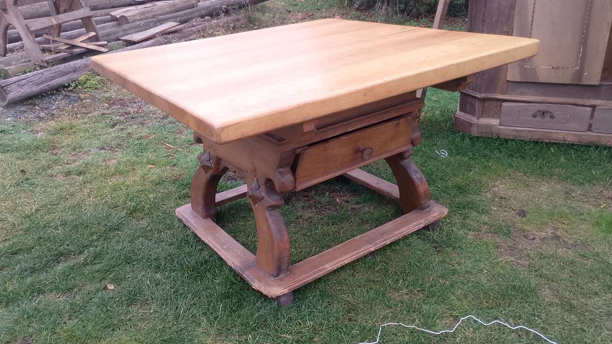 Hier habe ich einen urigen sehr schön patenierten Jogltisch. Er hat eine 6 cm dicke und schwere Eschenholz Platte und der Unterbau ist in Weichholz. Natürlich hat er auch die so typische Brotlade. Unten bei der Trittleiste ist es ein wenig abgenützt sieht man bei den Fotos. H 78 cm 120 cm x 120 cm Habe jeden Samstag und Sonntag für sie geöffnet oder nach Vereinbarung Zustellung Österreichweit ins Haus pro Adresse €80.- Mache auch Möbeln nach Maß mit allen Materialien sollten sie eines haben wollen. MFG Emil Antik Stinatz