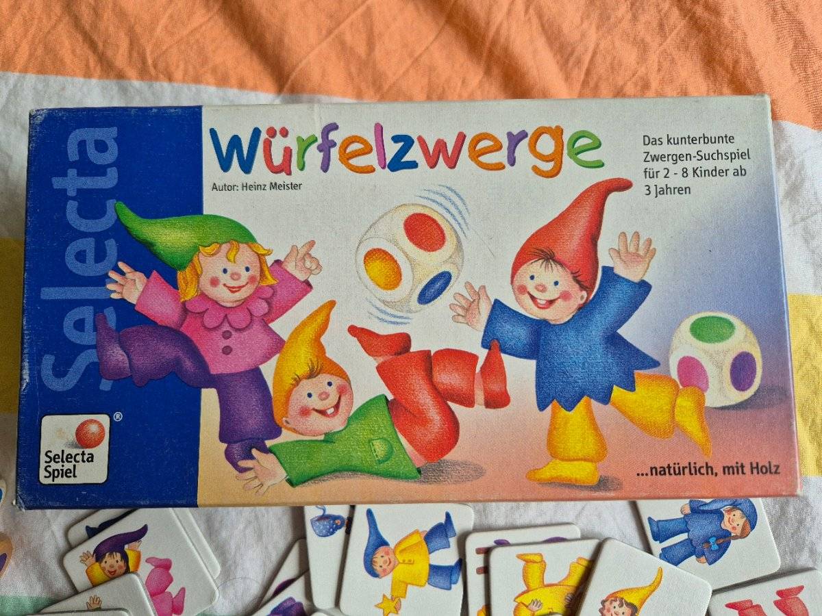 Ich verkaufe das sehr süße Kinderspiel Würfelzwerge von Selecta. Man würfelt mit 3 Farbwürfeln und sucht dann den passenden Zwerg dazu. Leider ist ein Würfel abhanden gekommen, jetzt hab ich einen anderen dazugegeben und mit einem pinken und einem lila Farbpunkt versehen. Guter bespielter Zustand, vollständig.