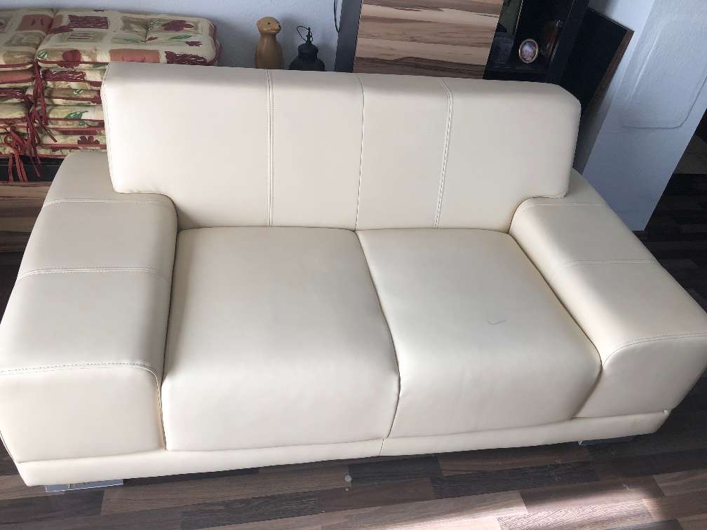 Verkaufe 2-Sitzer Sofa wie abgebildet, auch hinten mit Leder bespannt, einen schmalen Filzstiftstrich von ca. 2cm auf der Sitzfläche, sonst sehr guter Zustand.