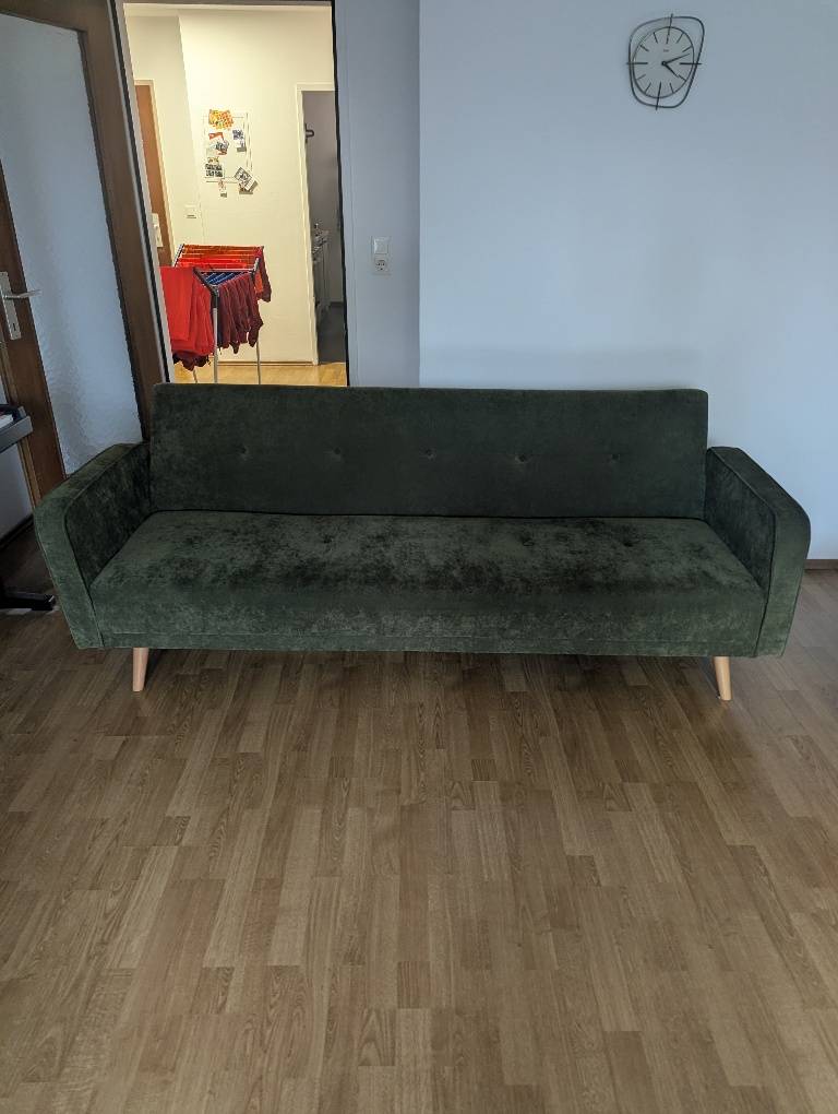 220x81 (BreitexLänge), Dunkelgrün, Samt. Umklappbar mit Schlaffunktion. Keine Haustiere, Nichtraucher.