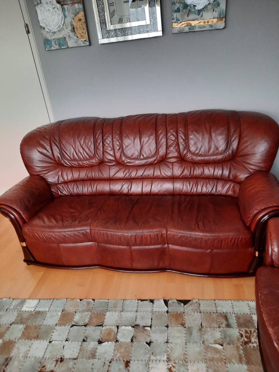 Verkaufe nach langem Besitz Sofagarnitur 3-2-1 gebraucht mit Gebrauchsspuren - leichte Risse sowie auf den Fotos , alle für 150€. Nur Selbstabholung.