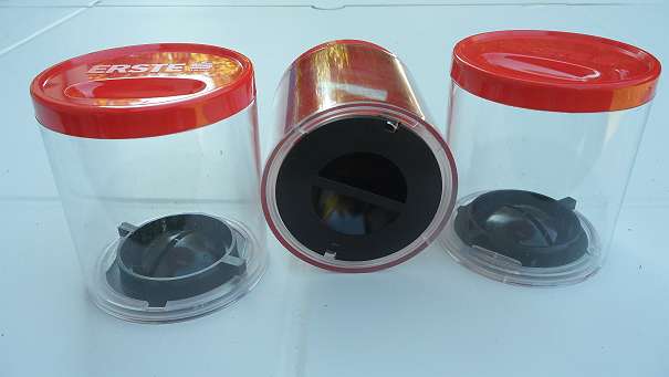 3 Spardosen, durchsichtig, mit Schraubverschluß Höhe 8,5 cm Durchmesser 7,5 cm. Die Dosen kann man bemalen oder mit Bilder bekleben oder hineinstecken, auch einzeln