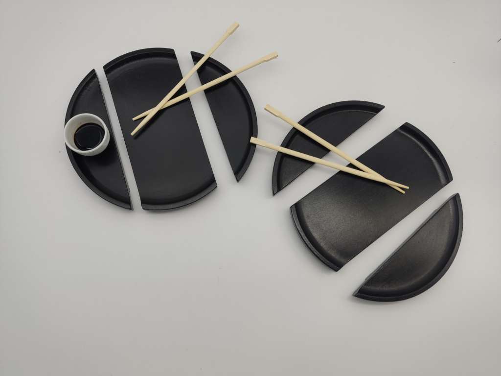 Dieses originelle Sushi Set wurde in unserer Lebensarbeit Werkstatt nach eigenem Design angefertigt. Mit Schwerpunkt Upcycling wurden gebrauchte Holzschneidebretter neu aufbereitet und für das Sushi Set neu aufbereitet.