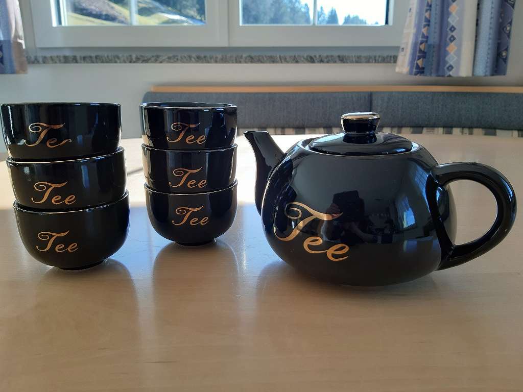 Verkaufe ein schönes Tee - Set, bestehend aus einer Teekanne und 6 Schälchen, schwarz mit Goldrand und Goldaufschrift, Kanne- Höhe ohne Deckel = 9,5 cm, Schale- Höhe = 5,3 cm, Durchmesser = 7,7 cm, gebraucht, aber gut erhalten, da und dort ist der Goldrand ein bisschen weniger, bei einer Schale ist das 2. "e" verblasst.