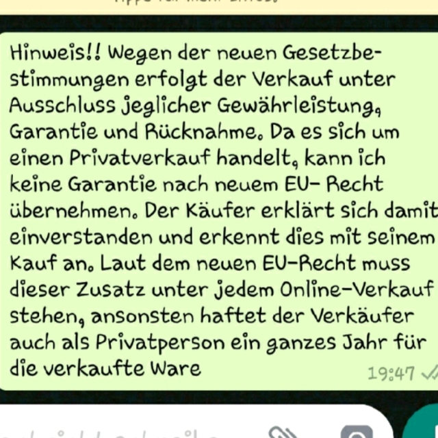 Der Vertrag kommt nicht mit willhaben zustande. Allfällige aus dem Abschluss des Vertrages resultierende Rechte sind ausschließlich gegenüber dem Vertragspartner geltend zu machen. Der Inserent ist Verbraucher. Die im Verbraucherschutzrecht der Union verankerten Verbraucherrechte finden auf den Vertrag keine Anwendung.