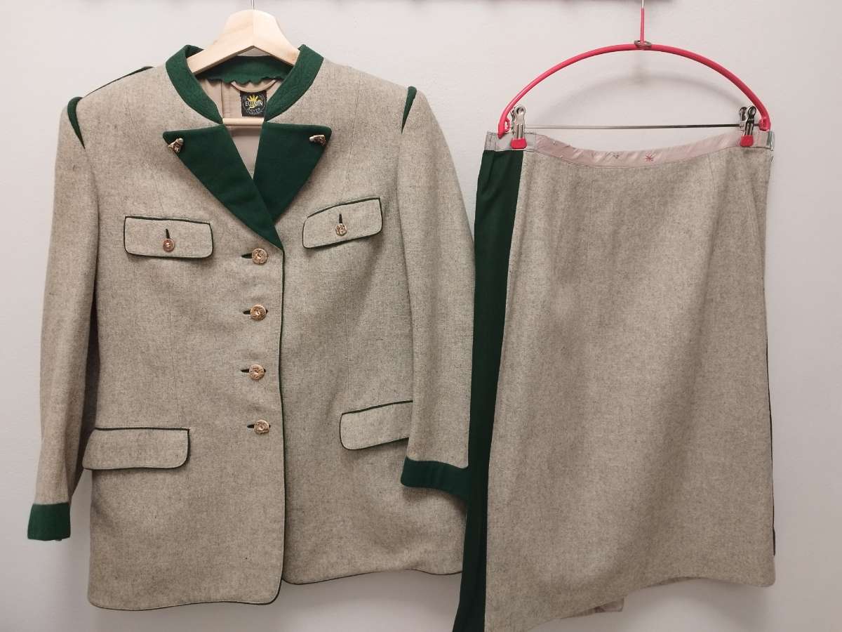 Damen Trachtenkostüm, Loden, Vintage, Eulan-Logo der Firma Bayer Leverkusen, Gütezeichen-Mottenecht, dunkelgrüner Stehkragen, Knöpfe Hirschhorn, Größe ca. 40/42