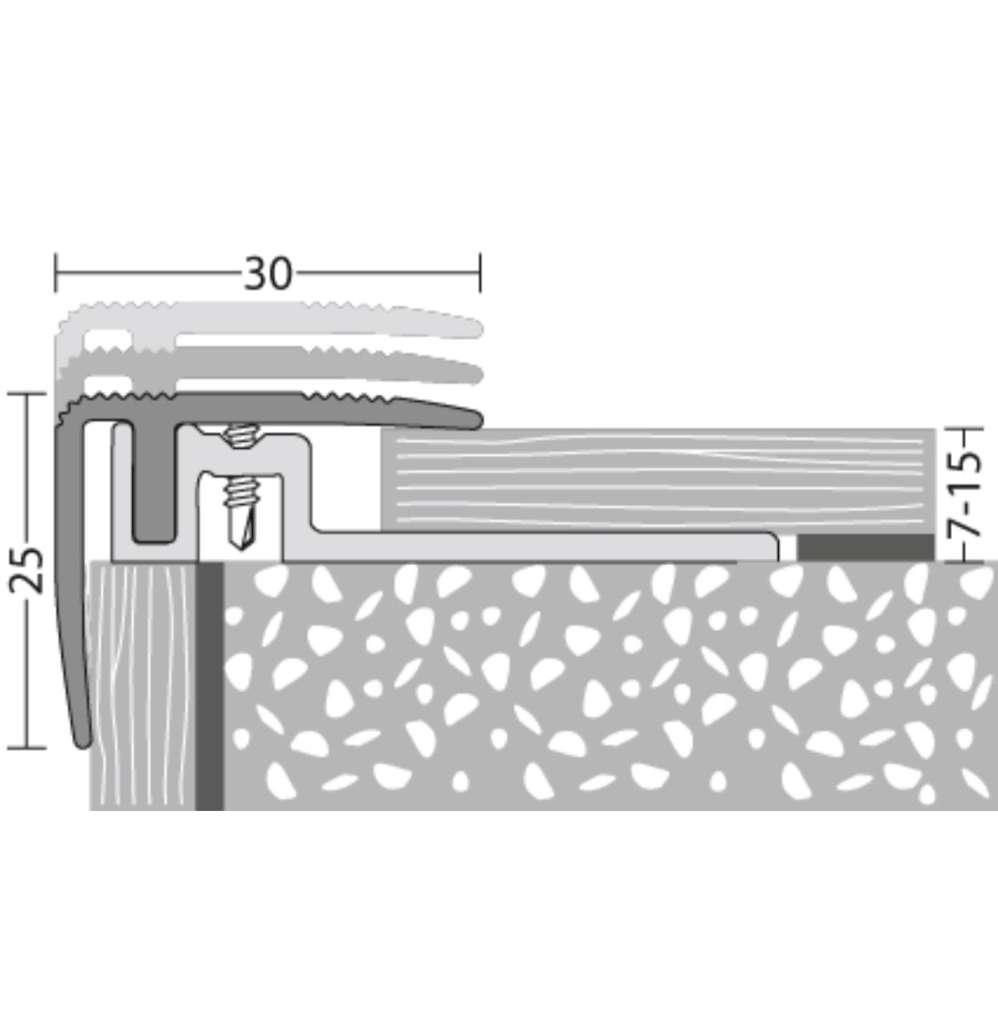 Das Treppenkantenprofil - Silber mit Schraubsystem, ist konstruiert für die Verarbeitung von Laminat, mehrschichtigen modularen Belägen sowie Parkett mit Belagsstärken von 7 - 12mm.