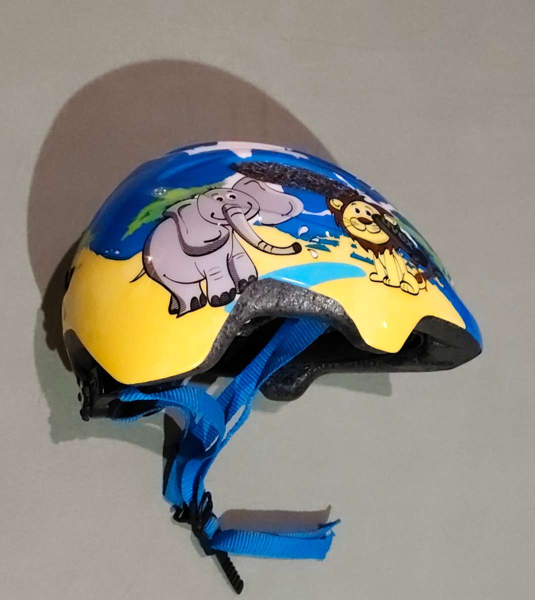 Mit süßem Tiermotiv (Elefant & Löwe) und blauen Riemen.
