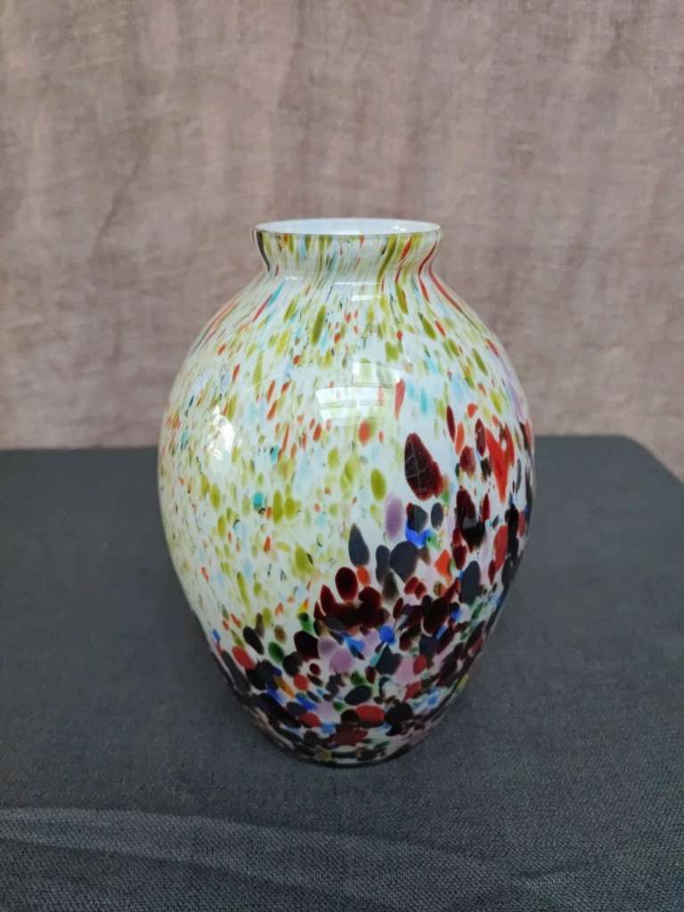 Vintage im Art déco Stil; vermutlich aus den 30ern- 50ern? Da mein Großvater aus der ehem. Tschechoslowakei kam, vermute ich aus einer böhmischen Glasmanufaktur? Jedenfalls ein wunderschönes, makelloses Stück; weißes Glas mit bunten Einschmelzungen.