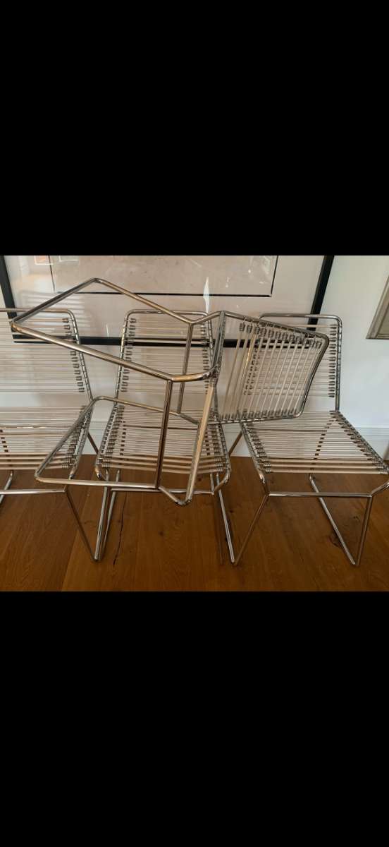 4 Stück Sandow Stuhl von René Herbst für Palluco 1980. Stuhl Stahlrohrgestell hochglanz verchromt, Sitzfläche mit aufgespannter Expander. Breite 42 cm, Tiefe 50 cm, Höhe 81 cm.