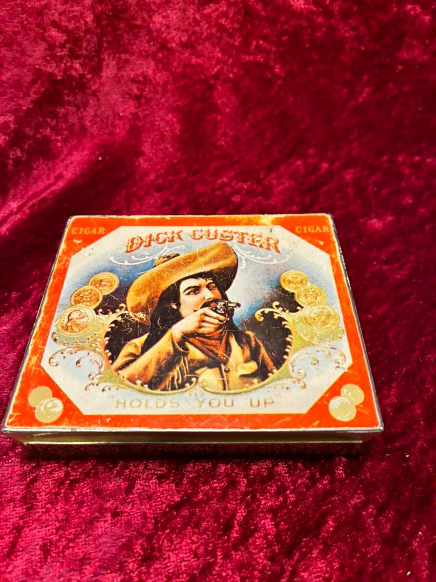 Verkaufe eine dekorative Vintage Zigarrenschachtel mit dem Motiv „Dick Custer – Holds You Up“. Die Schachtel zeigt einen Cowboy mit Revolver, umgeben von Goldmünzen und Ornamenten – ein echter Hingucker im Wildwest-Stil. Ideal als Sammlerstück, Deko-Objekt oder nostalgisches Geschenk. Zustand: gut erhalten mit altersbedingten Spuren.