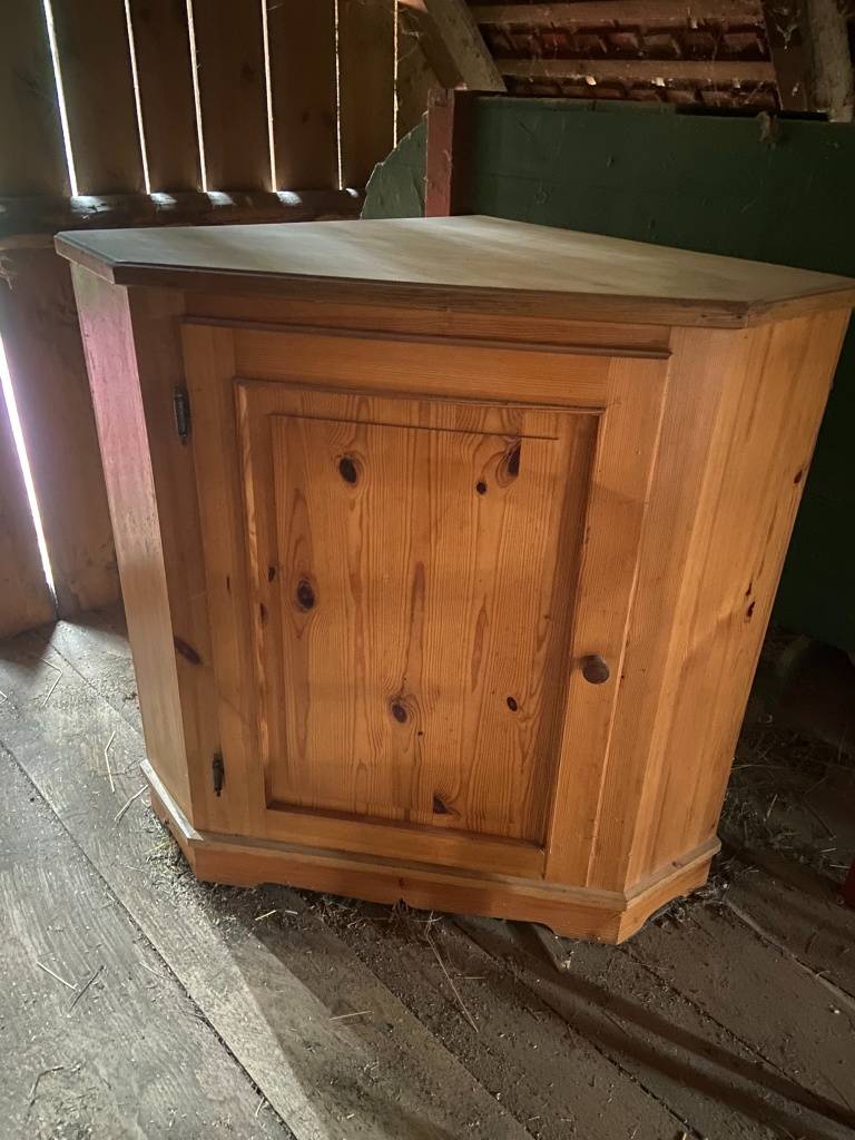 Schöner, kompakter Eckschrank aus Vollholz im rustikalen Bauernstil. Ideal zur platzsparenden Nutzung von Raumecken – perfekt für Wohnzimmer, Vorraum oder auch als Zusatzschrank.