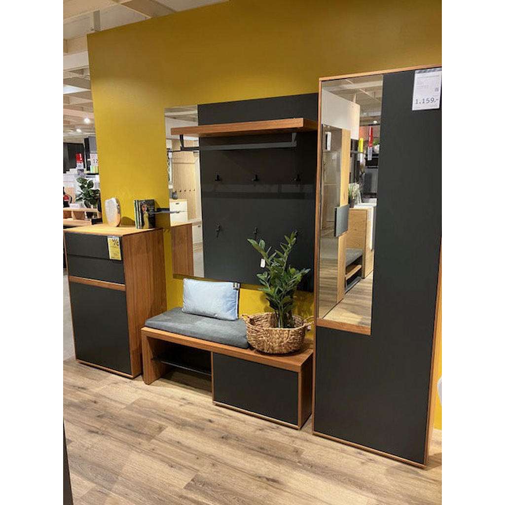Vorzimmerset bestehend aus: Schuhschrank: 63x110x42 cm Garderobenbank: 123x43x42 cm Garderobenpaneel: 120x123x30 cm Garderobenschrank: 63x198x42 cm Material: Nussbaum echtholz / Lack Antrazith