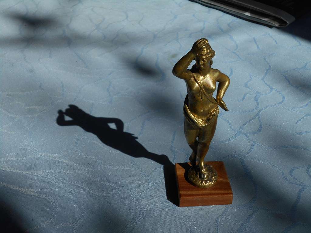 weibliche erotische Figur in Tanzhaltung wohl nach antiken Vorbild Gelbmetall auf quatratischen Holzsockel, Gesamthöhe 13 cm,