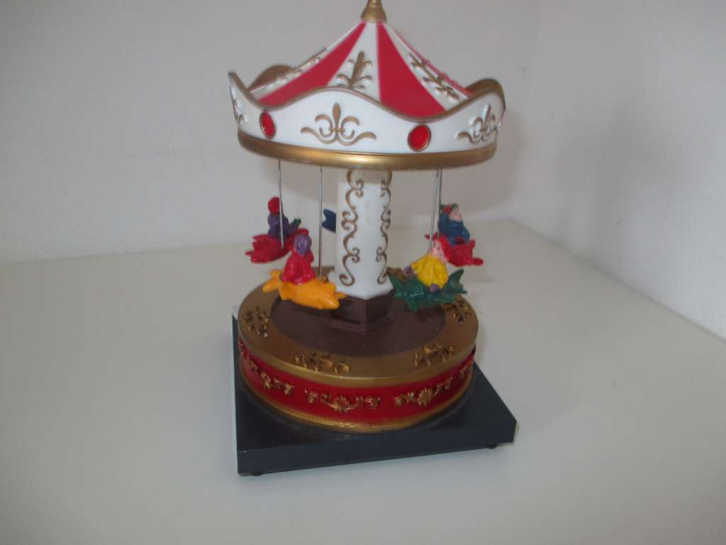 Habe dieses hübsches Karusell, länge ca. 12 cm, breit 12 cm u. Gesamthöhe 19 cm, wie am Bildern ersichtlich abzugeben. Ohne Batterie !!!!!