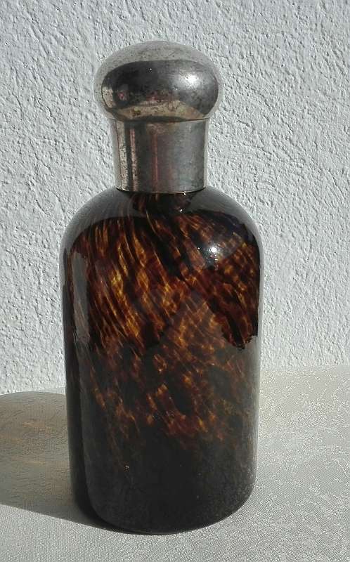 Wunderschöne Flasche / Karaffe aus braungesprenkeltem / bernsteinfarbenem Glas, mit Metalldeckel. Keine Sprünge oder Absplitterungen.