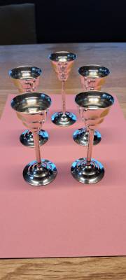 Zum Verkauf steht ein Set aus 5 Stück Schnaps/Likörkelchen aus den 1950er Jahren, versilbert, die Kelche haben eine Höhe von 10cm und einen Durchmesser von 4cm am oberen Rand, sowie 4,5cm am unteren Rand. Sie stammen aus österreichischer bzw. deutscher...