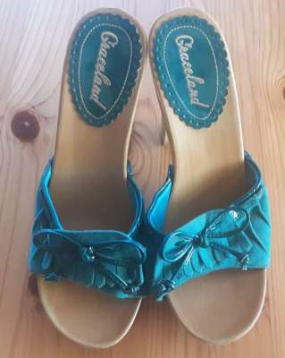 Graceland - Pantoletten in Türkis mit Holzoptik-Sohle, Fransen-Details und Schleifen-Applikation