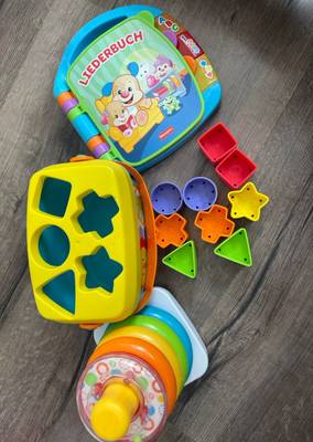 Set bestehend aus 3 motorikSpielzeugen für Babys/Kleinkinder: ein buntes StapelSpiel, eine steckbox mit verschiedenen Formen zum Zuordnen und ein MusikLiederbuch mit Seiten zum Umblättern. Alles in sehr gutem, bespieltem Zustand! Ideal zur Förderung von...